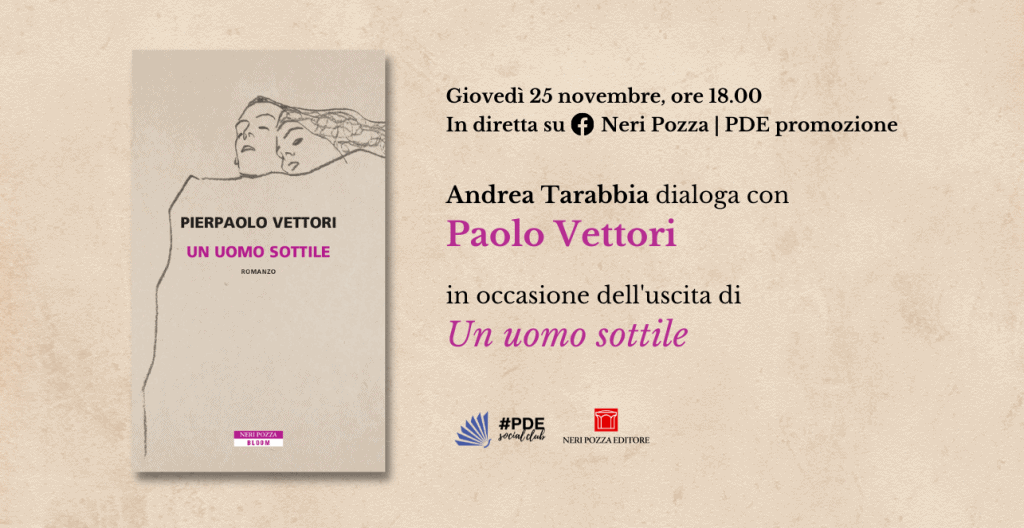 Giovedì 25 novembre alle 18.00, a #PDESocialClub festeggiamo un gran romanzo e l’assegnazione di un premio letterario. Stiamo parlando di Pierpaolo Vettori e del suo Un uomo sottile, vincitore del V Premio Neri Pozza per esordienti e pubblicato dalla casa editrice. A intervistarlo, Andrea Tarabbia, premio Campiello nel 2019 con Madrigale senza suono.
