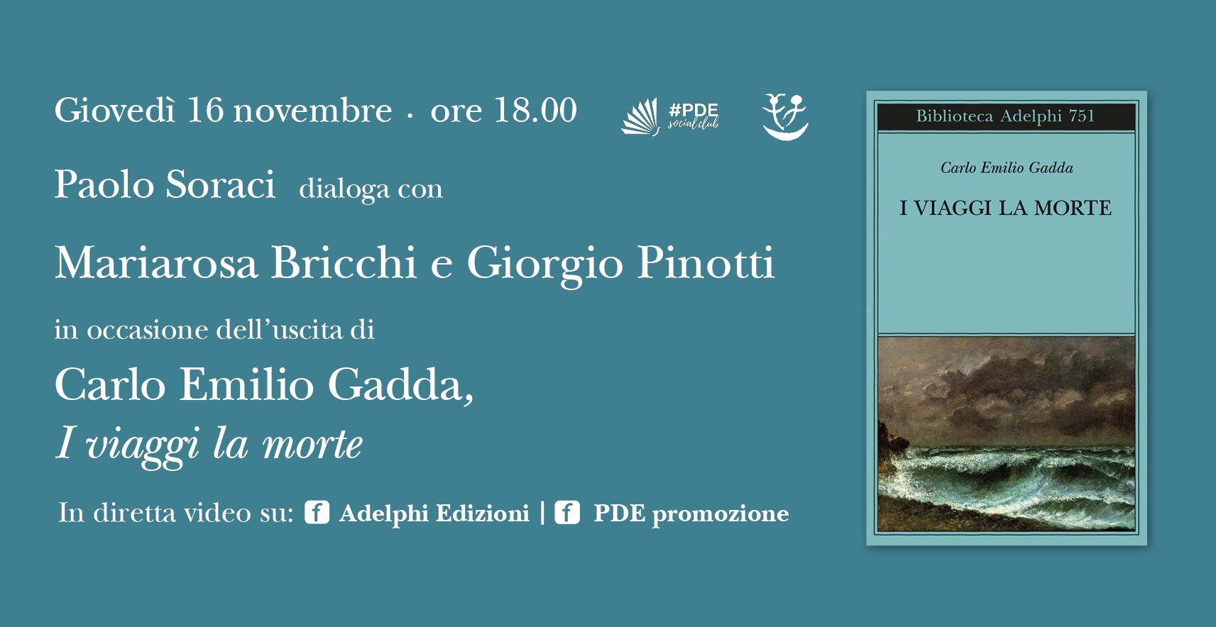 L’appuntamento è quindi per giovedì 16 novembre alle 18.00, in diretta streaming sulle pagine Facebook di PDE e di Adelphi, oltre che su quelle di tutte le librerie che vorranno condividere e sul nostro canale YouTube.