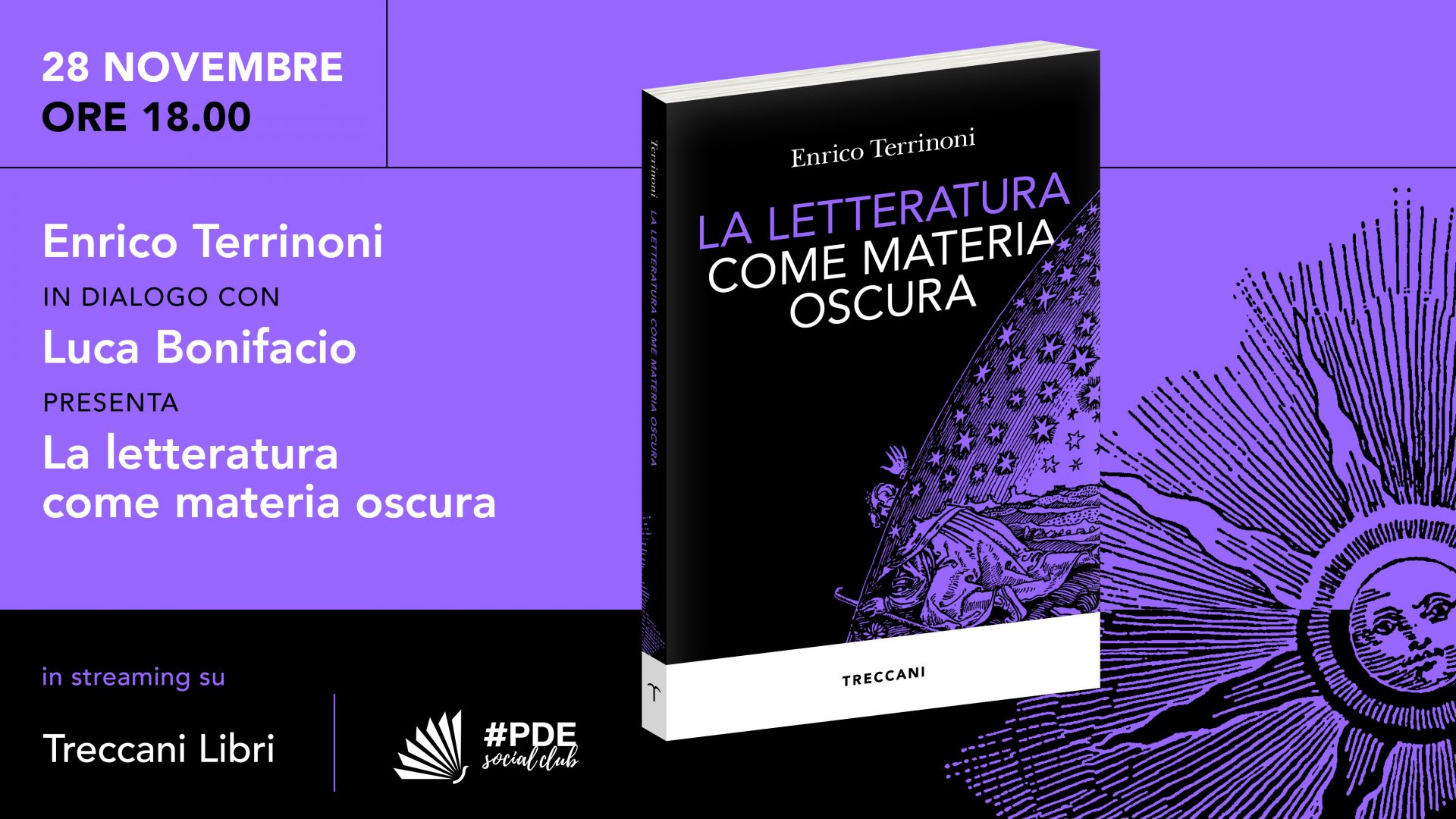 Che la letteratura fosse cosa oscura, un po’ lo sospettavamo. Ma che i suoi principi fossero più prossimi alla scienza di quanto non ci dica, qualche riserva ancora la tenevamo da parte, soprattutto per non far tremare i muri che ci circondano. A sciogliercela, quella riserva, e ad abbattere, quei muri, sarà ai microfoni di #PDESocialClub nientemeno che Enrico Terrinoni, ospite della puntata di giovedì 28 novembre alle 18.00, per presentare il suo nuovo saggio, oscuro e programmatico già solo dal titolo, La letteratura come materia oscura, appena edito da Treccani.