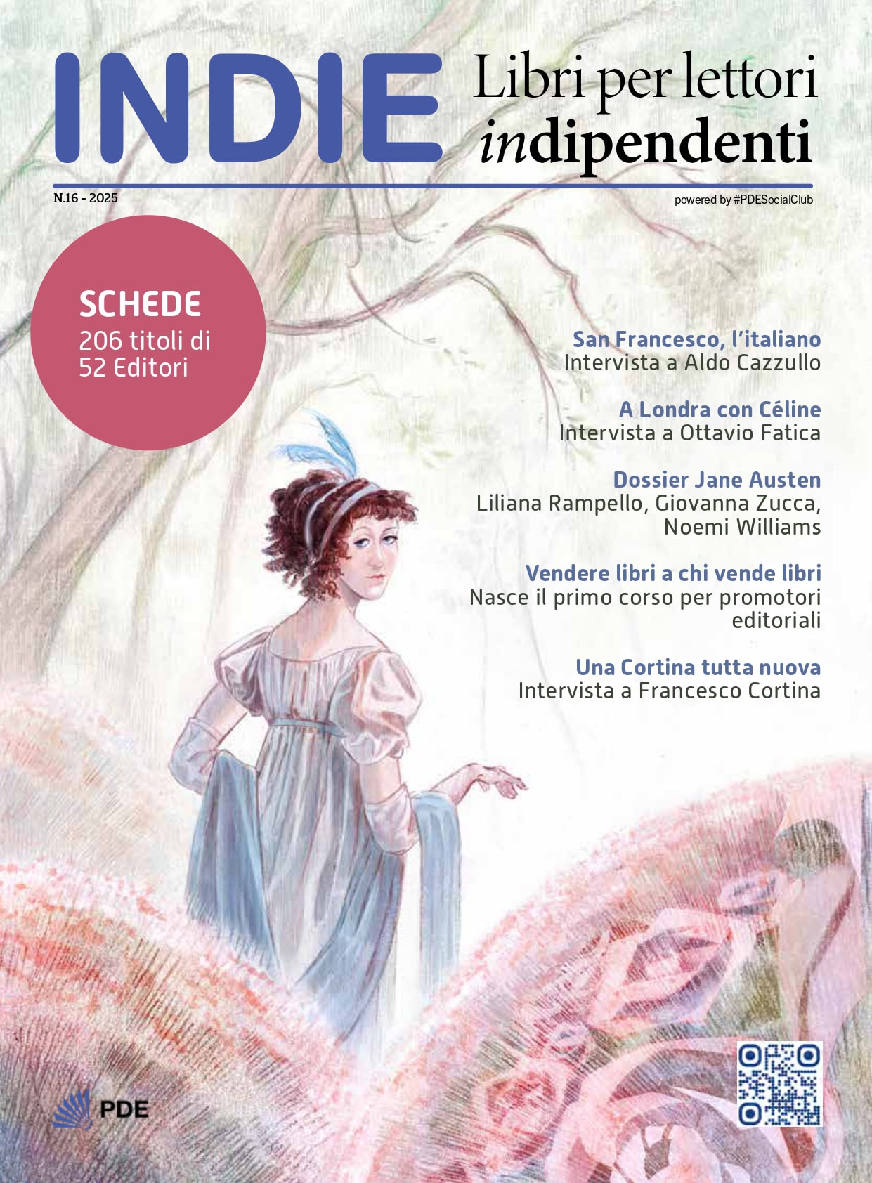 Come da tradizione, Più Libri Più Liberi 2025 porta con sé anche la nuova uscita di INDIE. Libri per lettori indipendenti, la rivista cartacea di PDE distribuita gratuitamente in 50.000 copie in oltre 500 librerie in tutta Italia, giunta al il sedicesimo numero. Dentro si possono trovare, come sempre, articoli, interviste e consigli di lettura per chi ama scoprire nuovi editori e voci fuori dal coro, ma con una veste tutta nuova. La più importante novità riguarda però la presenza di un dossier dedicato tutto ai 250 anni di Jane Austen: si parte con un’intervista a Liliana Rampello, critica letteraria e saggista, autrice di Un anno con Jane Austen edito da Neri Pozza, per poi passare a un articolo di Giovanna Zucca, autrice di Il segreto di Miss Austen, edito da Fazi, nonché fondatrice del Jane Austen Fest, un raduno annuale in cui chi ammira la scrittrice inglese può vivere un giorno alla maniera di Elizabeth Bennet. Terminiamo poi con un approfondimento sul libro pubblicato da Aboca di Molly Williams e Jessica Roux: Nel giardino di Jane Austen. Passando dai numeri che riguardano il mondo dell’editoria, passiamo a parlare di San Francesco con Aldo Cazzullo, volando poi verso Londra con Céline e finendo poi nella libreria milanese di Raffaello Cortina Editore.