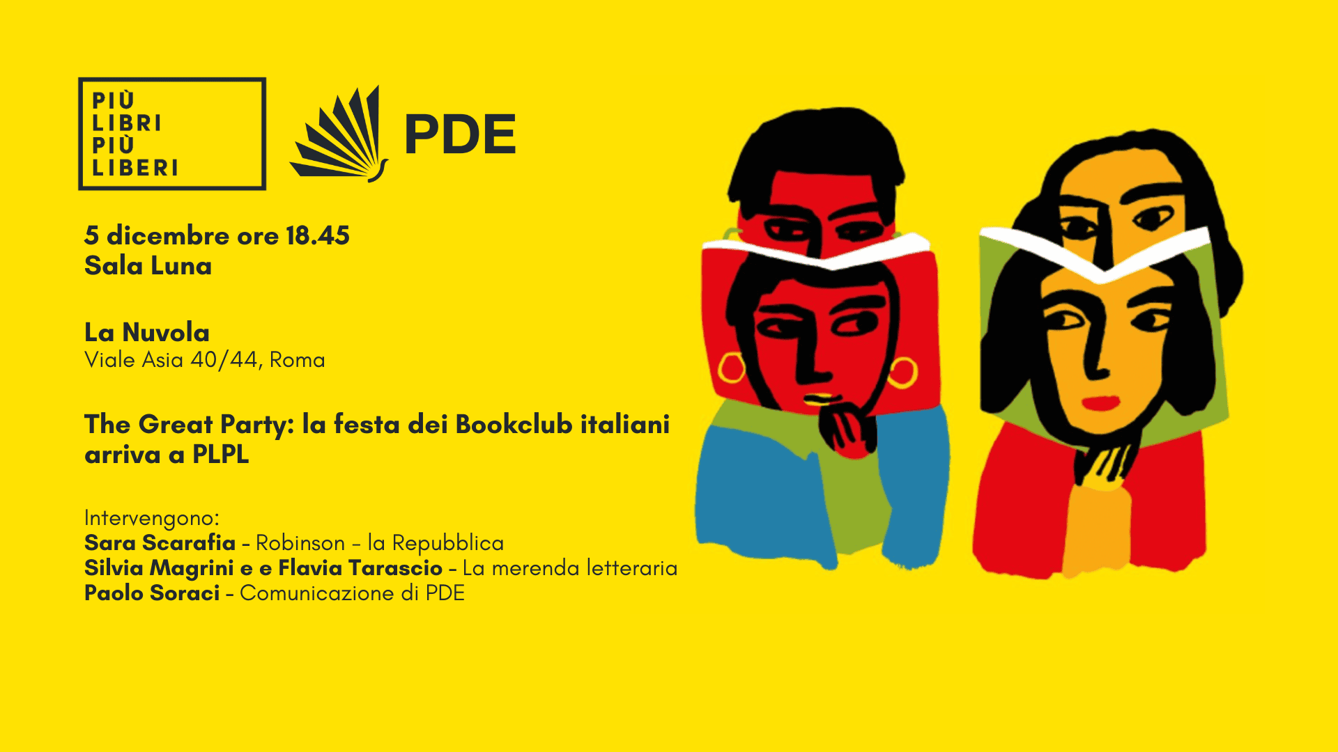 Chiudiamo poi in bellezza il 5 dicembre alle ore 18.45 in Sala Luna per “The Great Party: la festa dei bookclub italiani arriva a PLPL”. Dopo il successo del censimento nazionale dei gruppi di lettura, The Great Survey, PDE torna a celebrare la comunità dei lettori con un grande evento dedicato ai bookclub italiani. “The Great Party” sarà un momento di incontro e condivisione per tutti coloro che credono nel potere della lettura come esperienza collettiva. Musica, dialoghi e racconti di gruppo daranno vita a una vera e propria festa della lettura condivisa, nel cuore di Più Libri Più Liberi. Oltre a numerosi gruppi di lettura romani, tante case editrici con i loro autori e altri ospiti speciali: tra gli interventi sono previsti quelli di Sara Scarafia di Robinson – la Repubblica, di Silvia Magrini e e Flavia Tarascio del bookclub La merenda letteraria e anche un contributo relativo a S.T.O.R.I.E., la prima ricerca nazionale sui gruppi di lettura in Italia a cura di Chiara Faggiolani, direttrice del BIBLAB, avviata da Adei con il contributo del Centro per il libro e la lettura, in collaborazione con il Dipartimento di Lettere e culture moderne della Sapienza Università di Roma. È possibile assicurarsi un posto registrandosi a questo link.