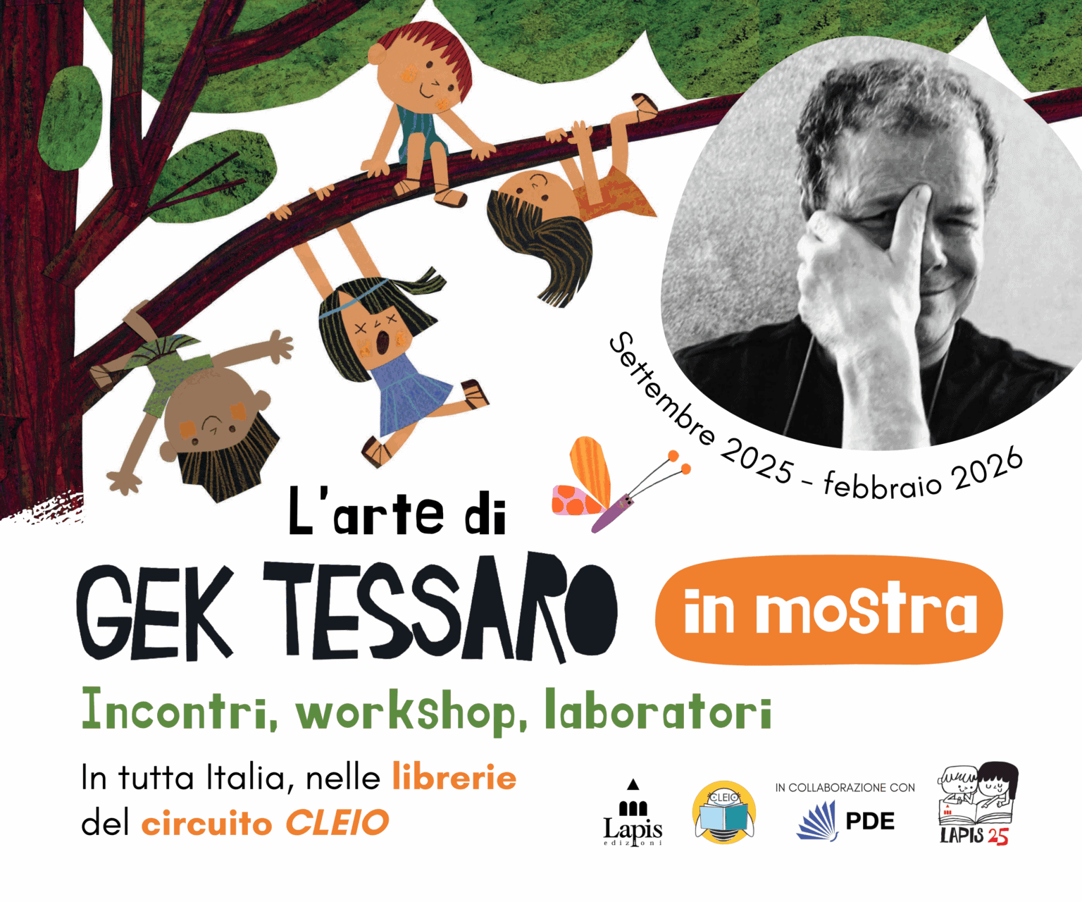 Illustratore e narratore per l’infanzia, Gek Tessaro, al secolo Ferdinando, nasce a Verona nel 1957. Dopo la formazione come maestro d’arte e operatore per l’infanzia, costruisce un percorso unico che unisce disegno, parola e musica. Tra gli autori di punta del catalogo Lapis Edizioni, Tessaro da anni porta in scena il suo teatro disegnato: nel buio suggestivo, la lavagna luminosa, una grande tavola retroilluminata su cui disegnare dal vivo, che proietta immagini ingigantite create con acrilico, collage, acquarello, inchiostri e sabbia. Disegnando al rovescio, spesso con entrambe le mani per effetti simmetrici, o animando sagome in metallo e cartoncino, genera scenografie bizzarre, poetiche e divertenti: un gigantesco libro che si anima, cresce e si dissolve col racconto. Accompagnato da musiche che determinano il timbro delle storie, riempie scuole, festival e spazi culturali. Con lui abbiamo parlato di come nascono le storie, del rapporto con i classici e le narrazioni tradizionali, del valore dell’osservazione come primo gesto creativo.